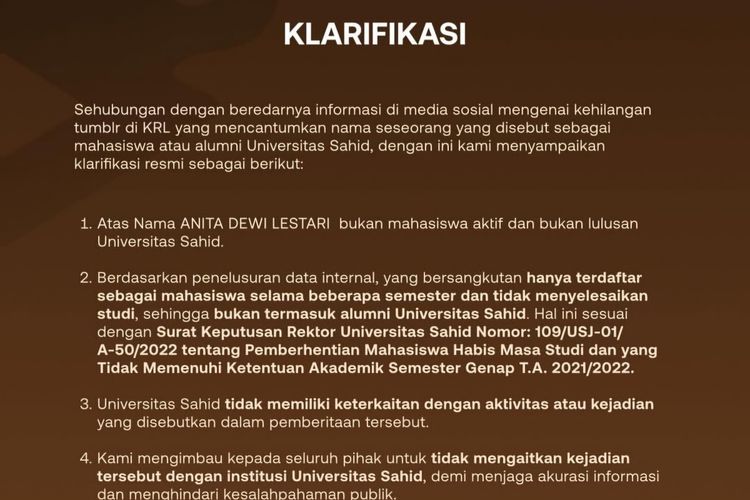 Sehubungan dengan beredarnya informasi di media sosial mengenai kehilangan tumblr di KRL yang mencantumkan nama seseorang yang disebut sebagai mahasiswa atau alumni Universitas Sahid, dengan ini kami menyampaikan klarifikasi resmi sebagai berikut: