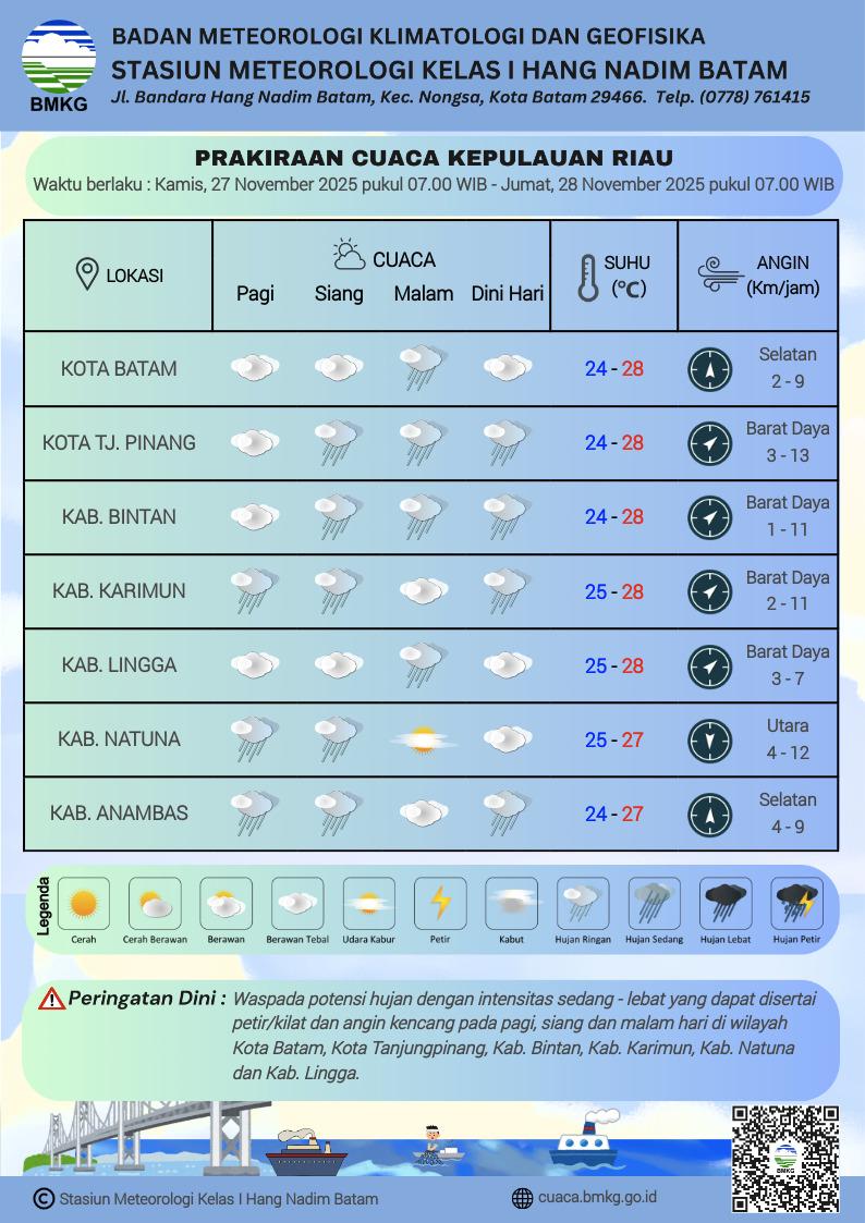 BATAM.id, BATAM - Simak prakiraan cuaca Kepri yang dirilis Badan Meteorologi, Klimatologi dan Geofisika (BMKG) kelas 1 Hang Nadim Batam, untuk hari ini Kamis (27/11/2025).