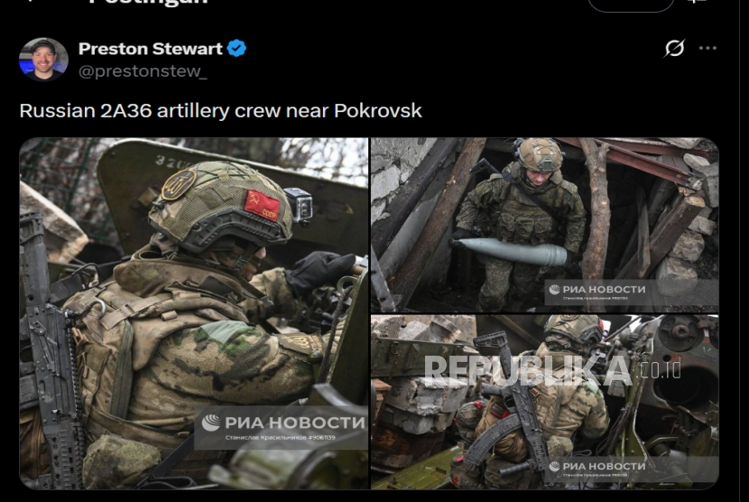 Foto tersebut diketahui berasal dari media Rusia, PNA HOBOCTN (Ria Novosti). "Operasi tempur meriam 2A36 Giatsint-B Grup Pasukan Pusat di Krasnoarmeysk dalam operasi militer khusus," demikian kutipan keterangan pada gambar tersebut.