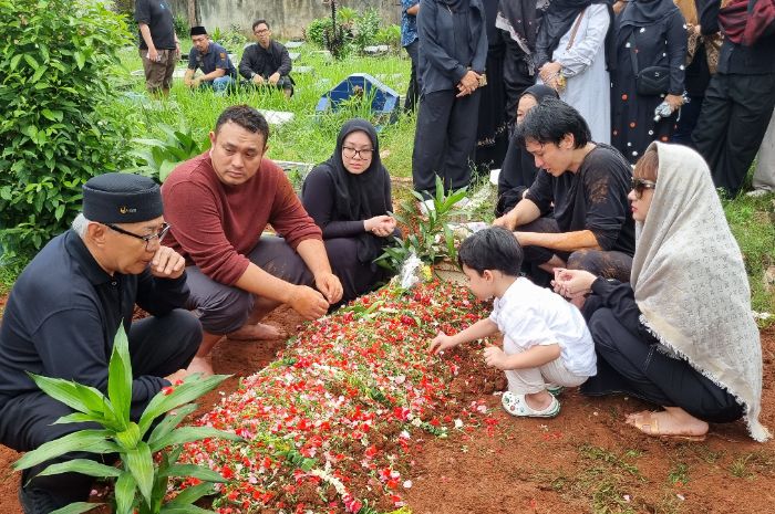 Gilang Dirga terlihat langsung turun ke liang lahat untuk menguburkan dan membacakan azan pada jenazah ayahnya dengan penuh keteguhan. (*)
