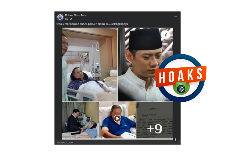Postingan menampilkan foto SBY sedang berbaring di tempat tidur rumah sakit. Juga terlihat foto putra SBY yang merupakan Ketua Umum Partai Demokrat Agus Harimurti Yudhoyono sedang sedih.