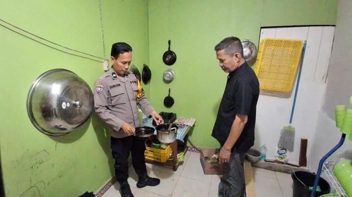 Petugas Bhabinkamtibmas Sebengkok, Aipda Samsudin, segera menuju rumah penyewa tempat kejadian perkara panci yang terbakar kemarin malam.