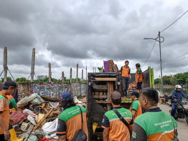 Pukul 10.12 WIB, petugas Dinas Lingkungan Hidup Jakarta Barat terlihat berada di lokasi bersama tujuh kendaraan pengangkut limbah. Mereka telah melakukan pengangkutan sampah tersebut sejak hari sebelumnya.