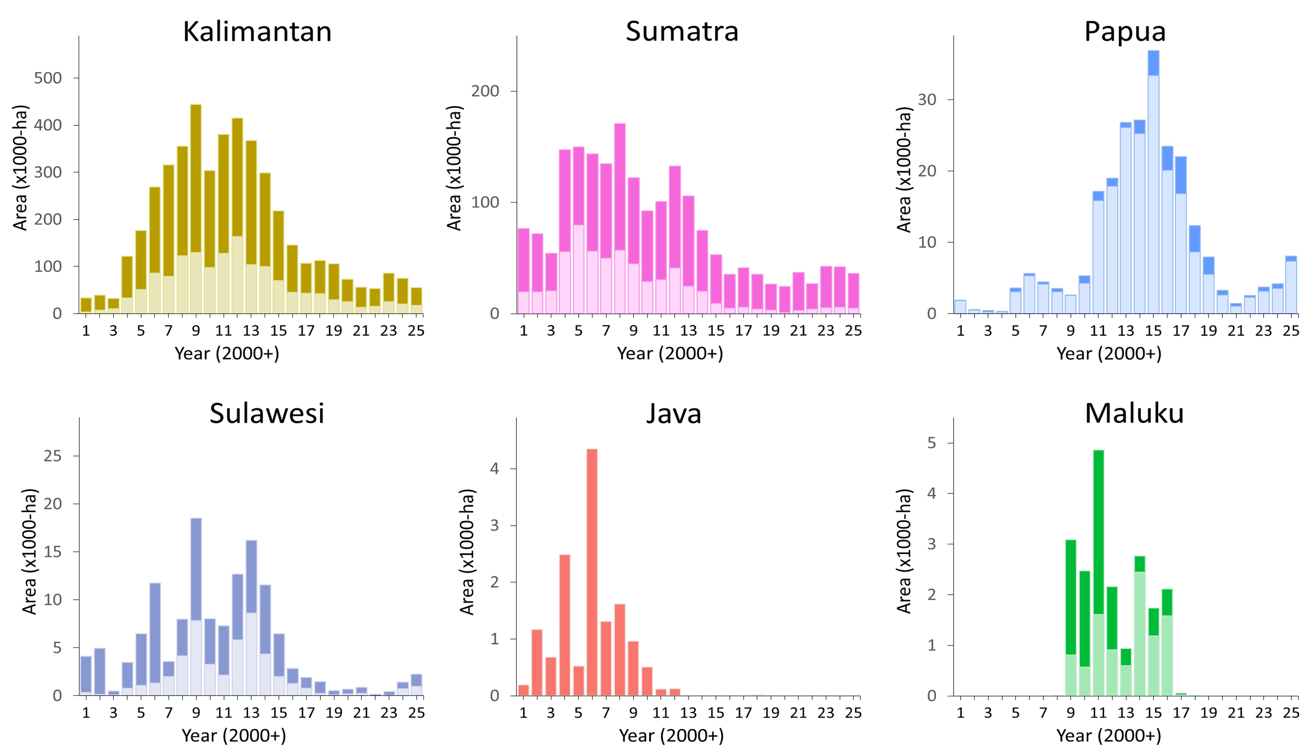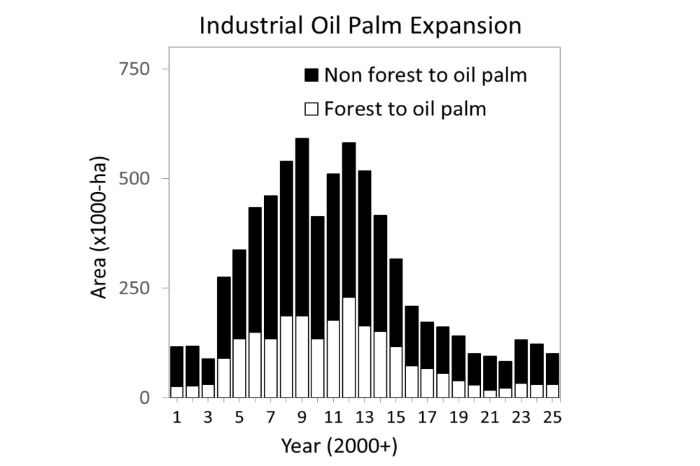 Secara regional, penyebaran kebun dan deforestasi yang berkaitan dengan ekspansi perkebunan kelapa sawit tercatat mengalami penurunan di Kalimantan dan Sumatra. Sebaliknya, tren peningkatan terjadi di Papua dan secara lebih kecil juga terlihat di Sulawesi.