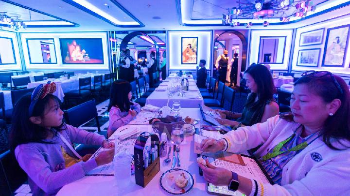 Keluarga wisatawan menikmati makan malam di restoran Animator's Palate selama pelayaran uji kapal pesiar Disney Adventure di perairan Singapura, 6 Maret 2026. Tempo/Nita Dian