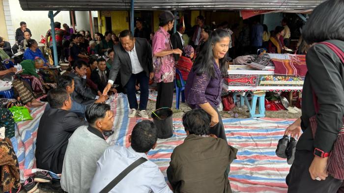 Widow almarhum, Boru Panjaitan, terlihat didampingi anggota keluarga menunggu jenazah suaminya dimakamkan setelah acara adat.