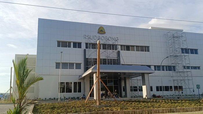 Bangunan terlihat megah dengan warna abu-abu. Di bagian depannya tertera nama RSUD Bobong serta lambang pemerintah kabupaten.